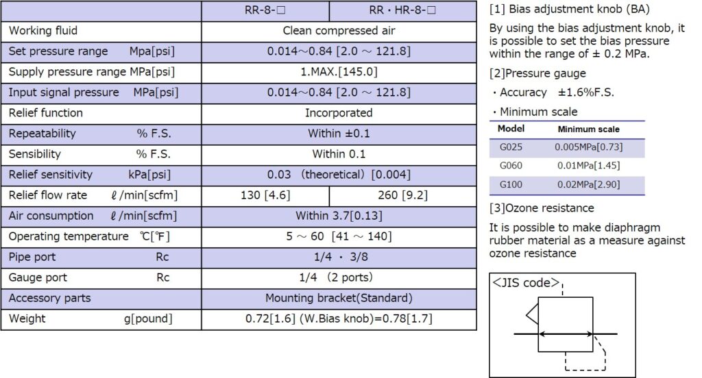 Servo-balanced system comprising rolling diaphragm and measuring capsule provides exceptionally precise and stable pressure control with constant bleed feature. RR series offers exceptionally precise 1;1 pressure relay control with ±bias adjustment capability by external pilot operation. However, the adjustment is ±0.2Mpa at maximum.