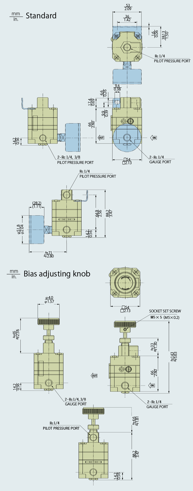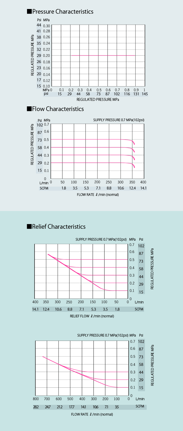 - Superior in relief, pressure, flow sensitivities. Particularly, minimum relief pressure (relief sensitivity) as low as 0.03kPa,0.004psi(theoretical value) finds best applications in tension control, air balancers and others.