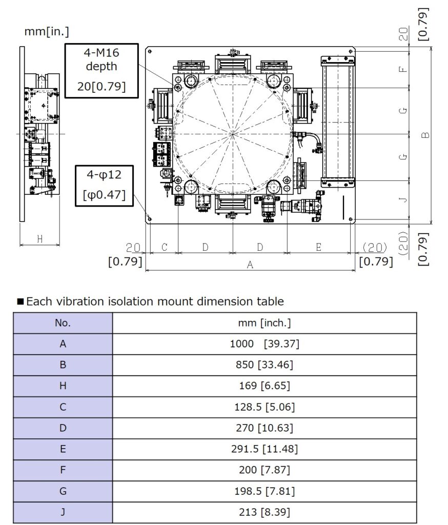 - Because it adopts a thin bellows system, it has a thin vibration isolator structure. The FVH – 2400F realized a height of 169 mm[6.65in.] (in neutral). Therefore, it is possible to keep the center of gravity of the equipment to be mounted low.