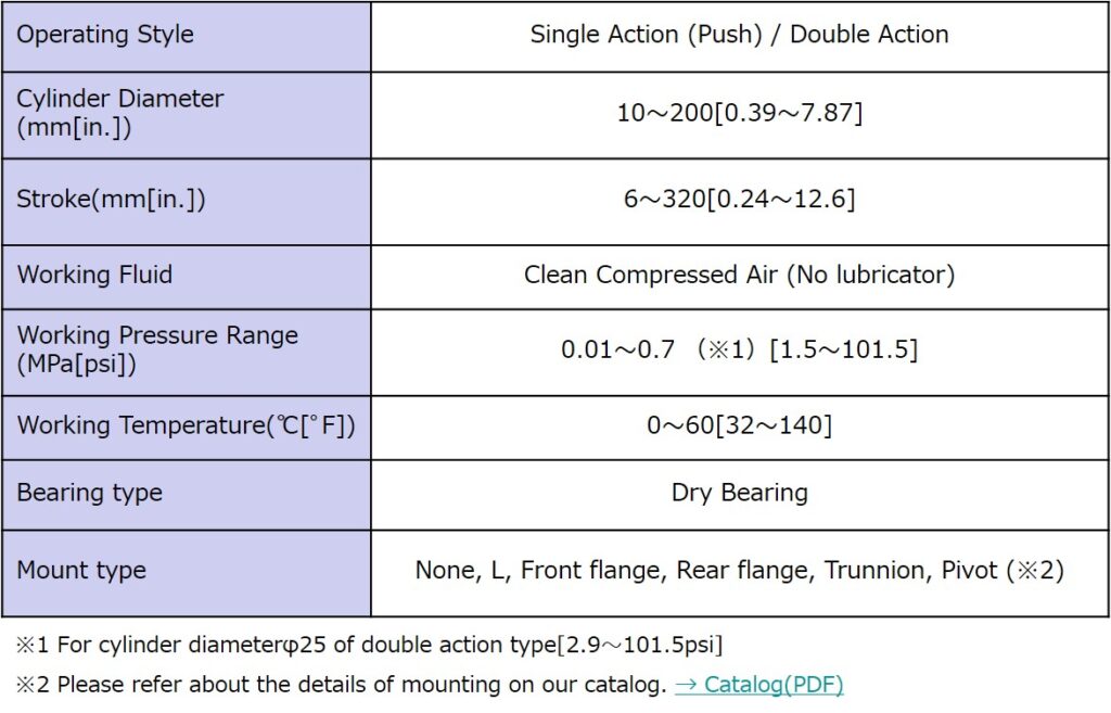 Standard BF cylinders using dry-bearing are designed in a variety of sizes from 10 to 200mm(0.39~7.87in).