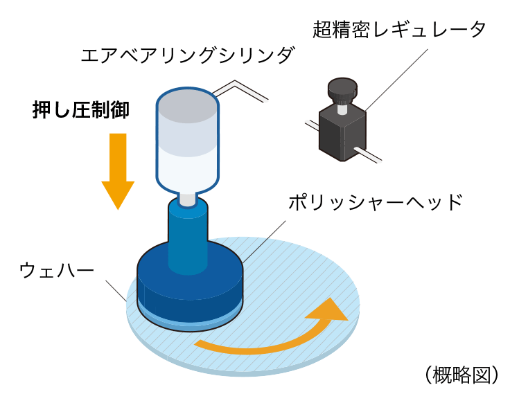 ドレッサーヘッドやポリッシャーヘッドの精密な押し圧制御で、精密なウェハー研磨が実現します。