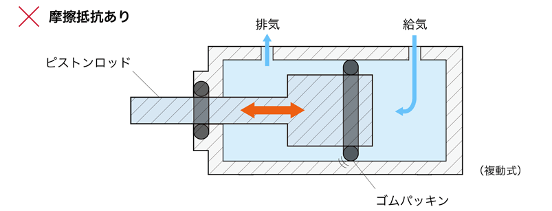 エアベアリングシリンダは、この静圧軸受の原理によって「摩擦抵抗ゼロ」を実現しています。
