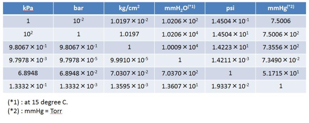 圧力単位換算表