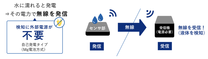 水を含む液体との接触によりセンサ自身が発電し無線報知が可能。