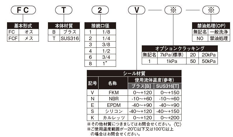| 備考 | ○最高使用差圧0.3MPa(出口大気解放条件時) ○オプションクラッキング圧力1、20、50kPa *1kPa選定時、取付方向出口上向き限定 ○ディスクフィルタ内蔵可(FCシリーズのみ) *詳細はお問い合わせください。 |